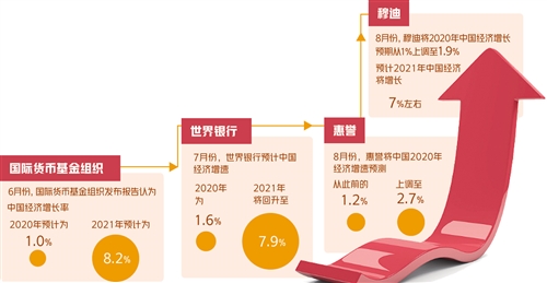 惠誉将中国全年GDP增长预期由原来的1.2%上调至2.7%;世界银行在7月底发布的《中国经济简报》中预测,中国的经济增速会放缓至1.6%,但相比于世界其他大国的“负增长”,这个成绩已经十分亮眼;IMF预计,2020年中国经济增长率为1.0%,是全球主要经济体中唯一能够实现正增长的国家。