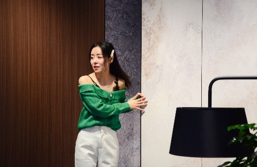 其中,原材料为高密度竹木纤维板的新型墙面装饰材料——墙咔,安又琪老师对其丰富的表现力尤为感兴趣,直呼相见恨晚,并称其为墙面装饰材料的革命性产品。