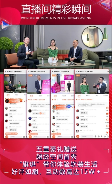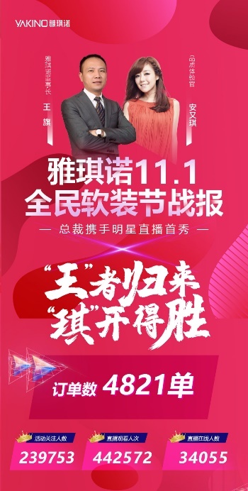 11月,雅琪诺「11.1全民软装节」,业内首场明星+总裁直播带货的圆满成功,标志着雅琪诺对直播这个风口领域的理解逐渐成熟,已走在行业前端。