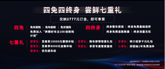 全新第三代奔腾B70在线下开启“四免四终身,尝鲜七重礼”预售政策。即日起至11月28日,用户只需交纳2777元订金,就能享受免车损险、免车船税、免交强险、免费加入“奔腾好车主UBI创新险计划”,获得终身整车质保、终身免费基础保养、终身免费道路救援、终身流量无忧。同时,更有舒享礼、智享礼、驭享礼等七重豪礼,为用户带来“购车无忧”价值体验。