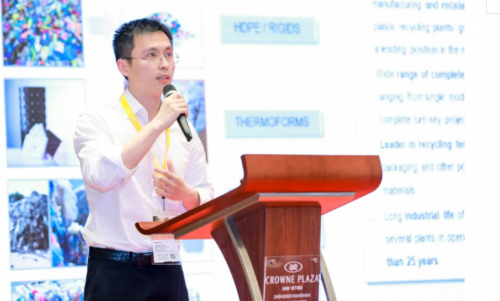 格诺斯塑料科技有限公司(Gneuss)技术销售经理Andreas Hunold介绍其废纤维回收循环解决方案,将PET纤维废料制成高品质纤维。MRS挤出机专为聚酯和回收应用开发,以100%回收料为原料,生产食品级的塑料包装材料。挤出前,材料不需要预处理,可实现更高效的脱挥、去污。