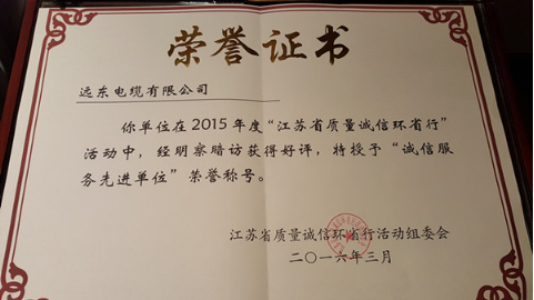 315日,2015年度“江苏质量诚信环省行”活动总结表彰大会在南京举行。远东智慧能源股份有限公司(简称:远东智慧能源 股票代码:600869)全资子公司远东电缆有限公司在2015年度“江苏省质量诚信环省行”活动中,经明察暗访获得好评,被授予“江苏省诚信服务先进单位”荣誉称号,成为江苏线缆行业唯一一家获得该荣誉的企业。远东智慧能源投资人、市场总监助理兼远东电缆市场总监慎叶昌代表公司参会并领奖。