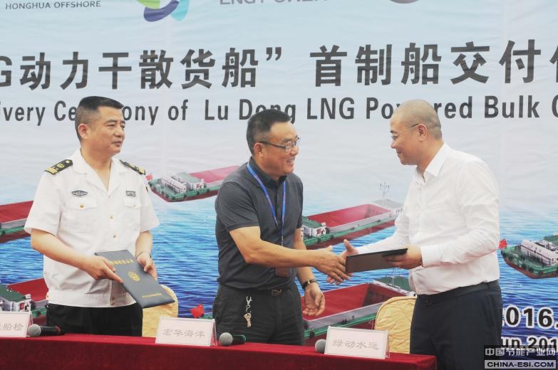 2016年6月16日上午,江苏启东宏华海洋油气装备(江苏)有限公司造船现场,在全球第一大造船吊机的背景下,绿动水上运输有限公司在宏华海洋油气装备(江苏)有限公司订造的大批量纯LNG动力内河干散货船的首制船交付仪式在盛大举行。
