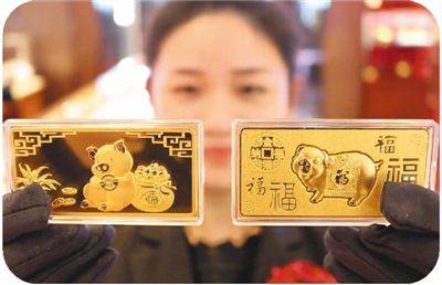江苏省苏州市观前街龙凤金店营业员展示猪年生肖金条。