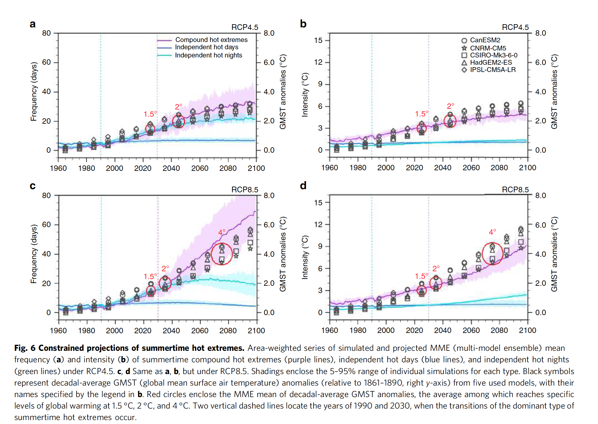 论文作者还展示了相关气候模型结果,研究了在两种排放场景下,复合极端事件未来有何变化。他们提出,在中度温室气体排放场景(RCP4.5)下,复合极端高温事件的发生频率将增加4倍,每个夏季达到32天;在重度排放场景(RCP8.5)下,将增加8倍,达到69天左右。
