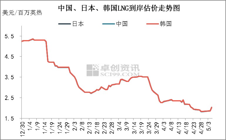 中国、日本、韩国LNG到岸估价走势图,来源:卓创资讯