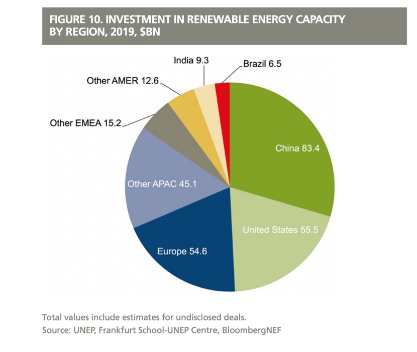 全球2019年可再生能源投资额分布情况。中国834亿美元,美国555亿美元,欧洲546亿美元