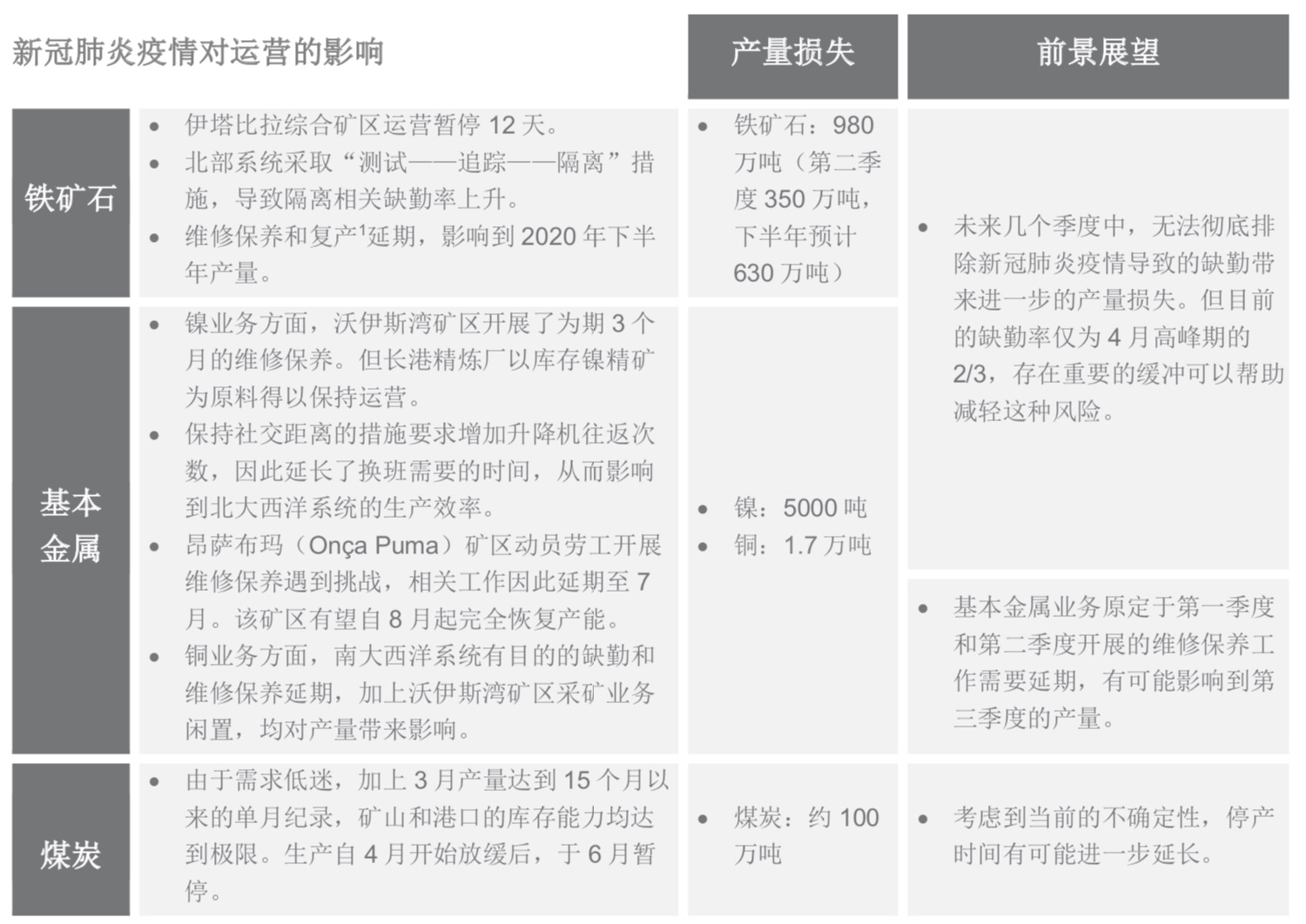 对第二季度产量产生主要影响的因素包括,第一、新冠肺炎疫情的相关影响 350万吨;第二、非经常性事件(如S11D对远距离传送带开展维修保养)影响210万吨;Fazendão 矿区因许可采矿区资源枯竭于2月停工,该矿区预计将在今年第三季度重启运营,今年剩余月份的月均产量在40万吨。