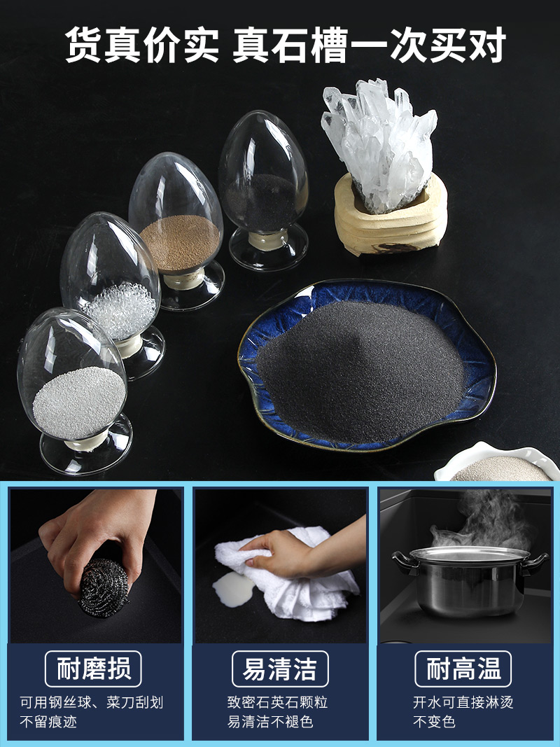 不锈钢水槽一直是我们使用的传统水槽,很多老人都是一直用着不锈钢的水槽。不过,虽然不锈钢水槽都打着耐划耐磨的旗号,但真正用过不锈钢水槽的都知道,长年使用后的不锈钢水槽,到处都是钢丝球走过的划痕,甚至还有餐具道具敲打出来的各种坑坑挖挖,时间一长在这些缝隙中就积攒了很多细菌和垃圾。石英石水槽作为水槽的新起之秀,在耐磨耐划方面比不锈钢水槽要好得多,菜刀砍出火花来,还是无法在槽体上留下痕迹。很多尝试过石英石水槽的朋友都说,石英石水槽用个几年,依旧是跟新买的时候一样。所以在材质方面,多花点钱买石英石水槽,能多用好几年,能让厨房一直保持美观,可以说物有所值啊!