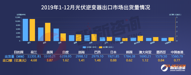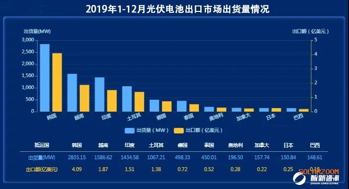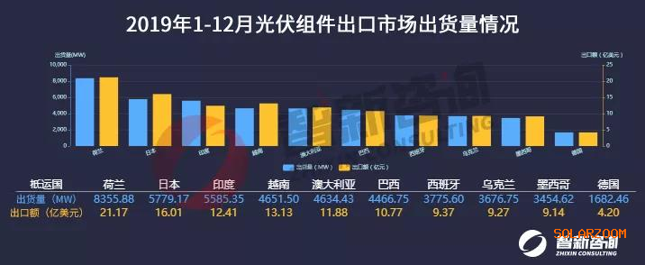 根据智新咨询统计,2019年中国光伏组件、电池、逆变器主要出口国家(地区)如下: