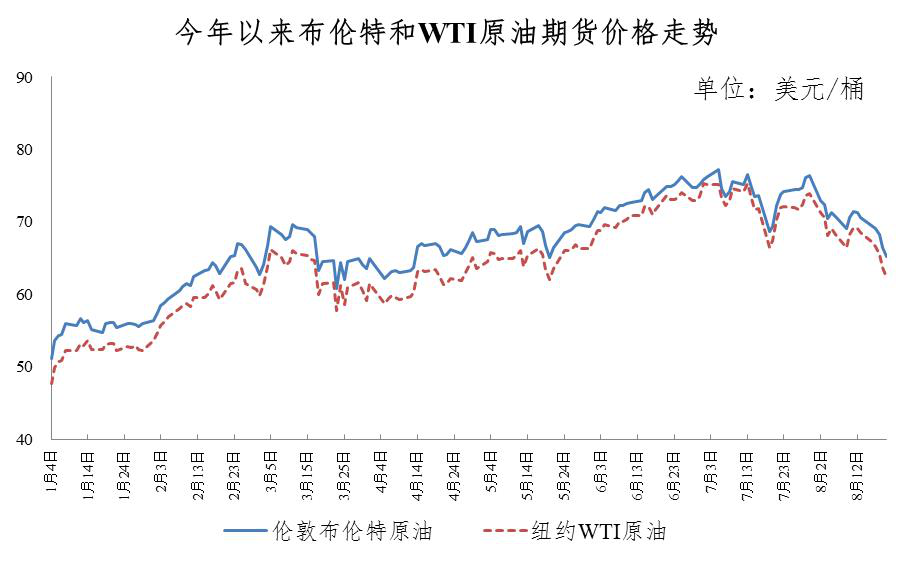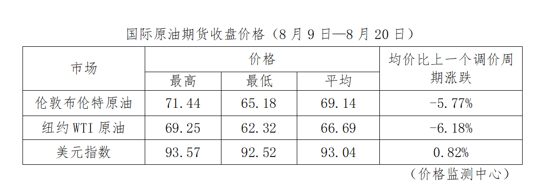 据国家发改委价格监测中心监测,本轮成品油调价周期内(8月9日—8月20日)国际油价大幅下跌。平均来看,伦敦布伦特、纽约WTI油价比上轮调价周期下降5.98%。