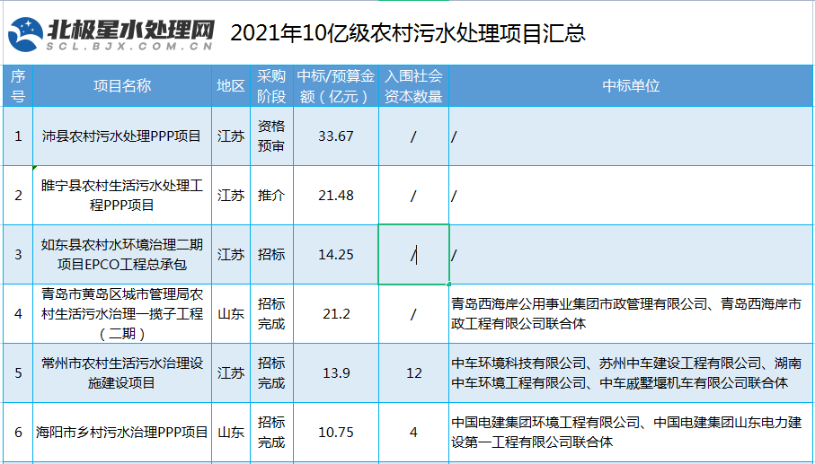 据北极星水处理网统计,今年以来,已有10大10亿+农村污水处理项目进入采购,10大项目投资总额高达242.63亿元。