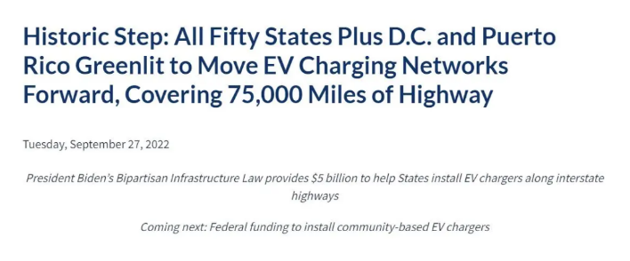 本月早些时候,美国总统拜登宣布,批准了35个州提交的建设电动汽车充电站计划,并将在2022至2023财年提供9亿美元的资助。