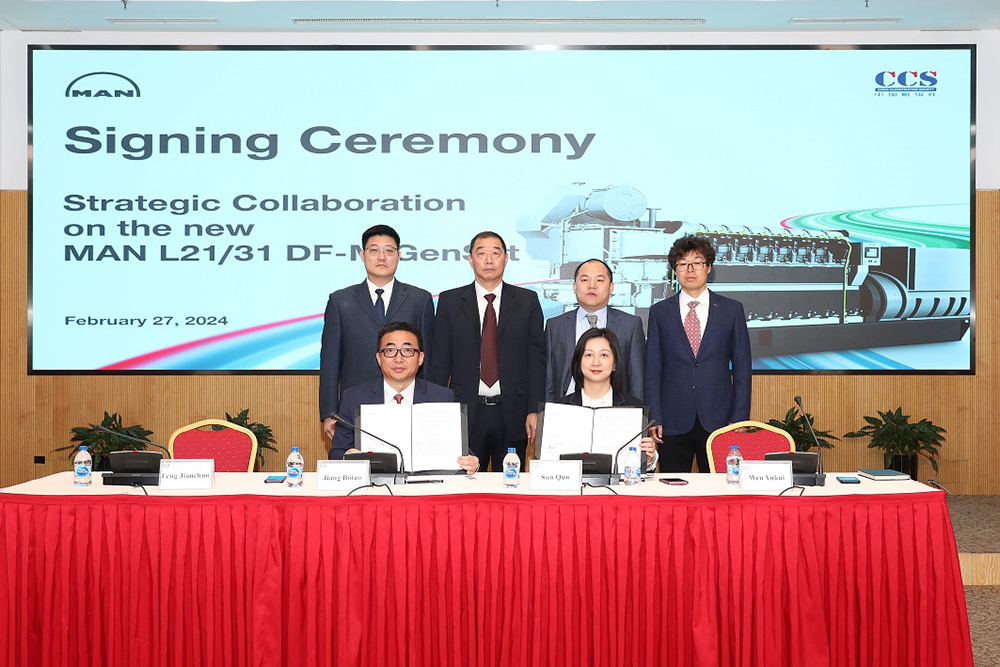 在 2024 年 2 月 27 日举行的在线仪式上,MAN Energy Solutions与中国船级社共同签署了一份分协议,该协议基于双方于2023年9月在北京达成的战略框架协议。此次签署的分协议,旨在推进“海运业的脱碳和数字化”这一主题,并计划为期五年。