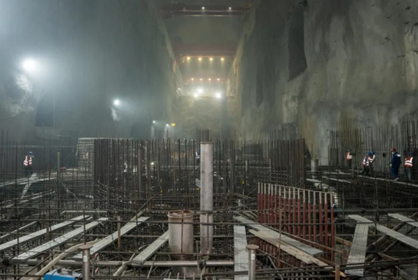 沿着隧洞向山体里行进,来到巨大的地下厂房施工现场,厂房一侧正在进行1号机组蜗壳底板混凝土备仓和埋件安装,另一侧机电安装间里1号机组蜗壳也正加紧焊接。