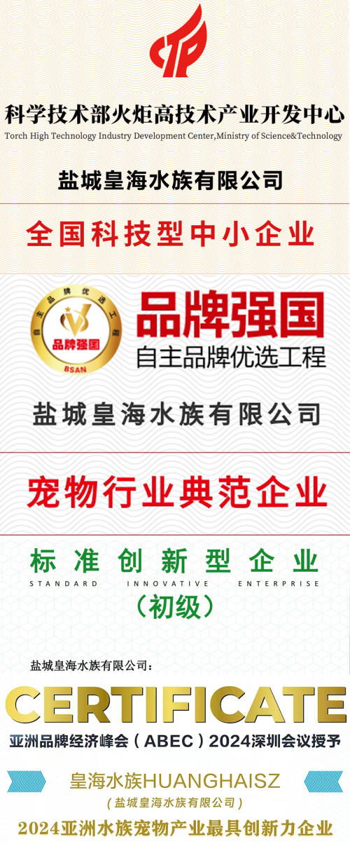 近期,皇海水族在业界屡获殊荣,荣获亚洲品牌500强经济峰会颁发的“水族宠物产业最具创新力企业”荣誉称号,并连续两年蝉联央视“品牌强国典范企业”称号。同时,该公司还被评为全国科技型中小企业和标准创新型企业,充分体现了其在科技创新与标准化方面的卓越实力。