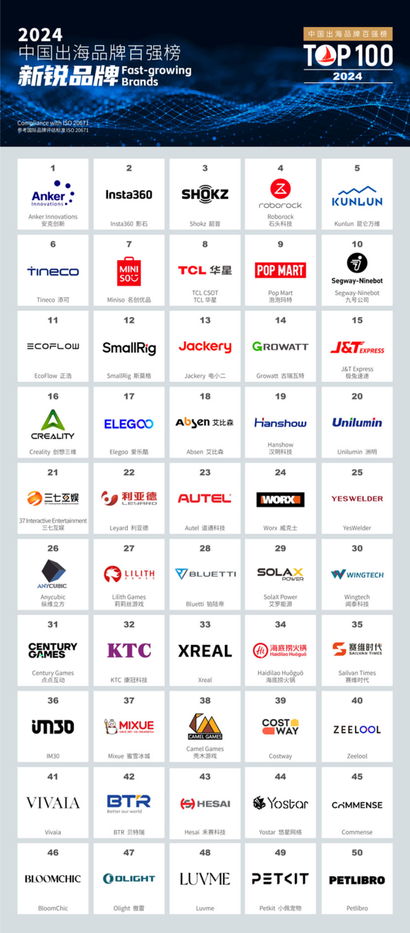 2024年9月27日,深圳工业总会、中国信通院广东工业互联网创新中心、龙睿国际品牌咨询在第十三届“五洲工业发展论坛”上联合发布《中国出海品牌百强榜》首届榜单。