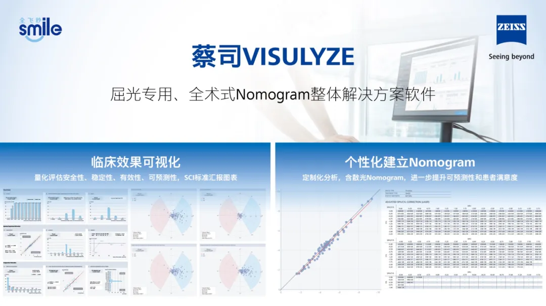 微创全飞秒精准4.0-VISULYZE 是蔡司新一代的微创全飞秒精准手术解决方案,是在标准全飞秒SMILE 3.0的基础上引入个性化Nomogram科学分析软件(VISULYZE),大数据统计量化分析手术安全性、稳定性、有效性、可预测性,使临床效果可视化,全环境、全流程、全变量控制影响因素,个性化精准定制用户屈光度调整值,助益患者获得更精准的视觉体验。