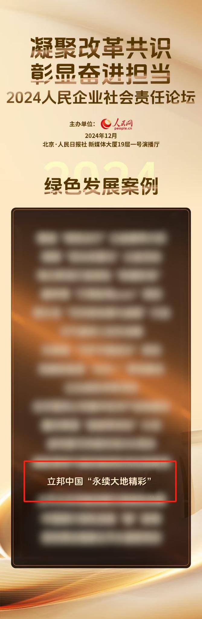 12月25日,由人民网主办的2024人民企业社会责任论坛在北京举行。论坛以“凝聚改革共识 彰显奋进担当”为主题,汇聚众多来自政府、学校、企业、媒体的嘉宾,共同探讨市场主体如何在企业社会责任领域发挥带动和支柱作用。期间,2024人民企业社会责任案例发布,立邦凭借高效的碳管理体系入选人民企业社会责任论坛“绿色发展案例”。