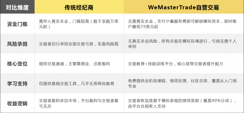 很多交易者选平台时都会纠结:“自营交易平台和传统经纪商到底不一样在哪?”“新手怕亏本金,该选哪种?”WeMasterTrade作为专业自营交易教育与技能发展的平台,今天就用通俗的对比,帮你看清关键区别,让你选对适合自己的成长路径。