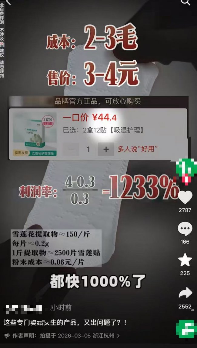 为何这类存在安全隐患的产品能长盛不衰?答案是高达1000%的利润率。据估算,一片含有此类粉末的护垫成本仅为两三毛钱,售价却高达三四元。