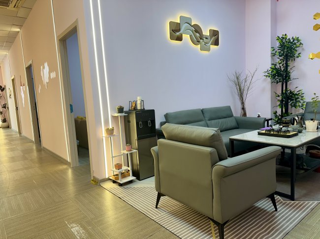 实景特色:醒目的粉色浪漫花墙成为到访者的视觉中心,营造出一种温馨、放松的沟通环境。