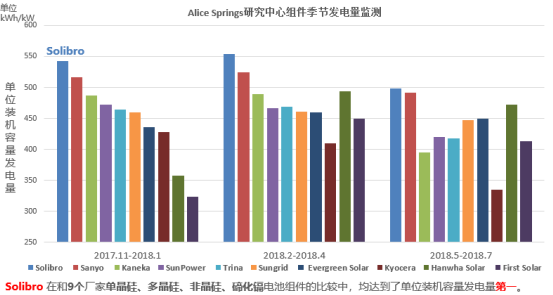 下图是汉能Solibro和其他光伏生产商自2017年11月至2018年8月,每季度主要组件单位装机容量发电量对比图,Solibro始终占据第一。在2017.11-2018.1期间,Solibro组件每KW发电 542.8度;2018.2-2018.4期间,Solibro组件每KW发电 554.2度;2018.5-2018.7期间,Solibro组件每KW发电 498.4度。