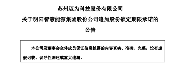 出于对光伏异质结技术路线的良好前景展望,为体现本次投资的战略性质,明阳智能自愿承诺追加上述迈为股份股票6个月锁定期(即本次认购的迈为股份向特定对象发行股票的限售期合计为12个月);自2021年12月22日至2022年12月21日不减持或以其他方式处置迈为股份的股份,包括承诺期间该部分股权因资本公积转增、派送股票红利新增的股份。