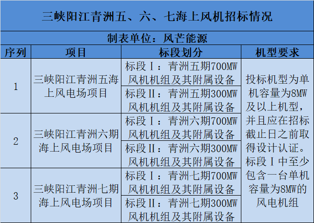 据风芒能源了解,三峡阳江青洲五、六、七海上风电3个项目核准的规划装机容量均为100万千瓦。3个项目均分为2个标段招标。标段一700MW,标段二300MW。