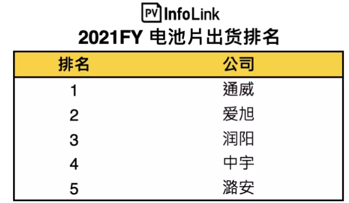 根据PV InfoLink调研数据统计,通威再度拿下全球电池片出货量出货量冠军,爱旭股份紧随其后,三四五名分别为润阳、潞安、中宇。和此前PV InfoLink公布的2021年上半年电池片出货量保持一致。