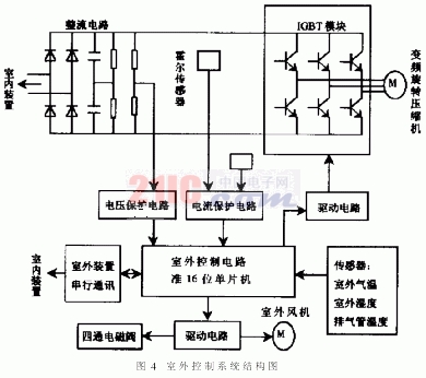 变频空调器采用由变频压缩机、电子膨胀阀、室内外换热器和风机系统构成的可变容量制冷系统,该系统主要完成三大调节功能,即压缩机功率调节、制冷剂流调节和热交换器能力的调节。其中压缩机功率调节由变频器完成,制冷剂流则由电子膨胀阀调节,而热交换能力由风扇调节。