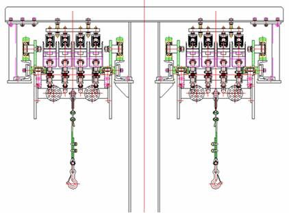 滑触线四根一组(三相四线)悬吊、固定在吊架上。每根滑触线的截面积为700mm2,额定电流为1000A,其容量能满足3台ERTG同时作业的需求。
