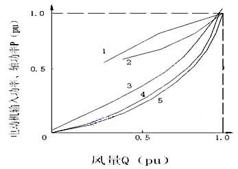 1—输出端风门控制时的电动机输入功率2—输入端风门控制的电动机输入功率3—转差功率调速(滑差电动机、液力耦合器)时电动机的输入功率4—变频器调速控制时的电动机输入功率5—理想输入功率