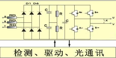 DFCVERT—MV变频器的功率单元是以交—直—交的形式组成的,它是先把工频交流电通过整流器变成直流电,然后再把直流电变换成频率、电压均可控制的PWM波交流电。它由三部分组成既整流器、逆变器和中间环节如图3.1所示:
