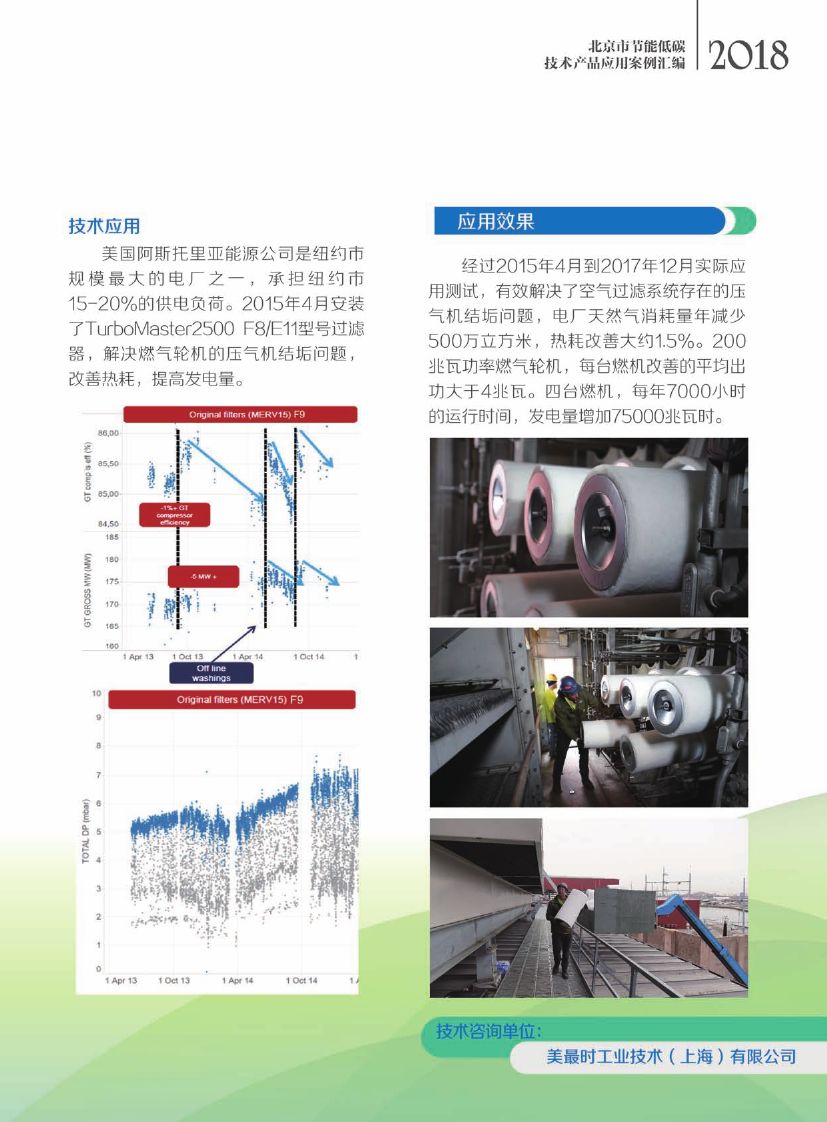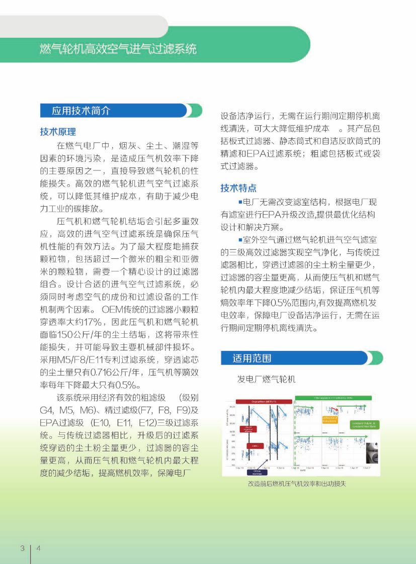 燃气轮机高效空气进气过滤系统技术将室外空气通过燃气轮机空气净化室的三级高效过滤器实现空气净化,达到燃气轮机空气净化要求,比传统高效过滤器净化程度高,降低了维护成本, 并保证压气机等熵效率年下降0.5%范围内,有效提高燃气轮机发电效率。