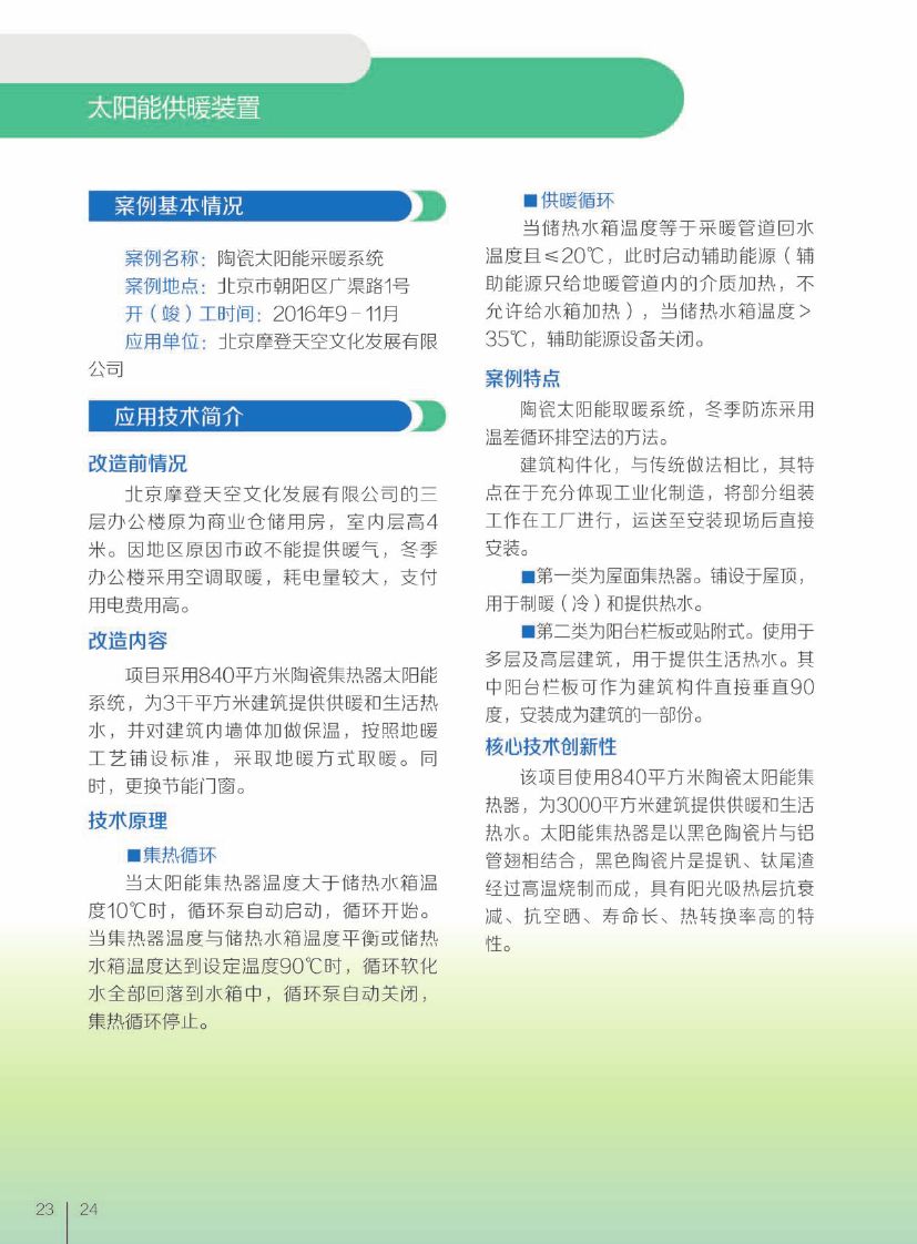 该产品以黑色陶瓷为吸热材质,阳光吸热层具有抗衰减、抗空晒、寿命长、热转换率高的特性,承压达 15千克,可以实现“建筑构件化”。应用案例供暖期太阳能保证率超过 60%,室内平均温度保持在 18-25℃。